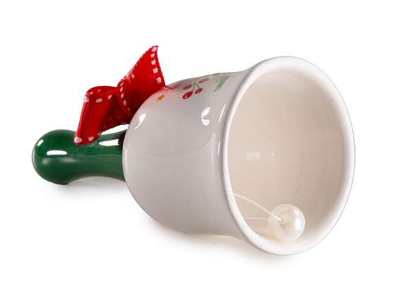 Campanella natalizia in ceramica con fiocco e decori in rilievo stelle di Natale e bacche, ottima come idea regalo e portafortuna
