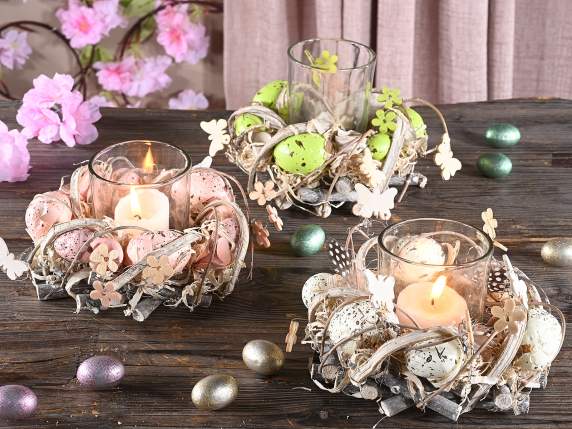Centrotavola con ovetti e portacandela in vetro