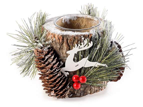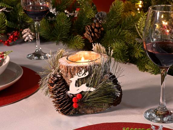 Il Centrotavola Portacandela è l'elemento perfetto per decorare la tua casa durante le festività natalizie. Realizzato in legno di alta qualità, con portacandela in vetro, è arricchito da pigne, rametti innevati e bacche rosse. Il tocco finale è dato dal decoro in legno a forma di renna, per una atmosfera natalizia davvero unica. Con questo centrotavola, ogni pranzo diventa un'occasione speciale.