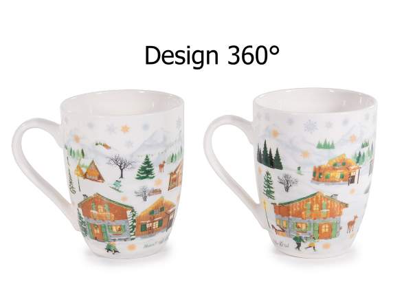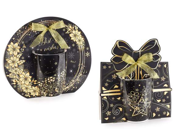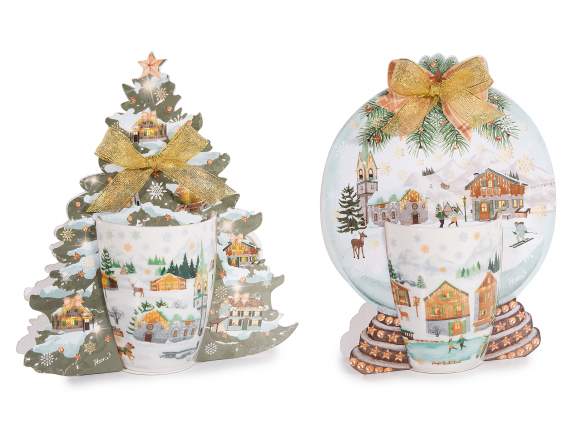 Tazze con decori natalizi, realizzate in porcellana, in confezione regalo sagomata con fiocchetto.