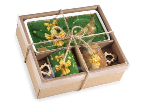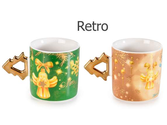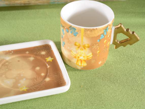Queste due Tazzine Natalizie con piattino, sono perfette per un regalo di Natale elegante e festoso. Con decori natalizi e manici in simil oro lucido, ogni tazzina aggiunge un tocco di classe alle feste di Natale. La confezione regalo include anche il piattino che può essere usato come vassoio, rendendo questa un'ottima scelta per chi ama lo stile durante le festività natalizie.Misure: Tazza: Ø 5,5 cm x 5,5 H